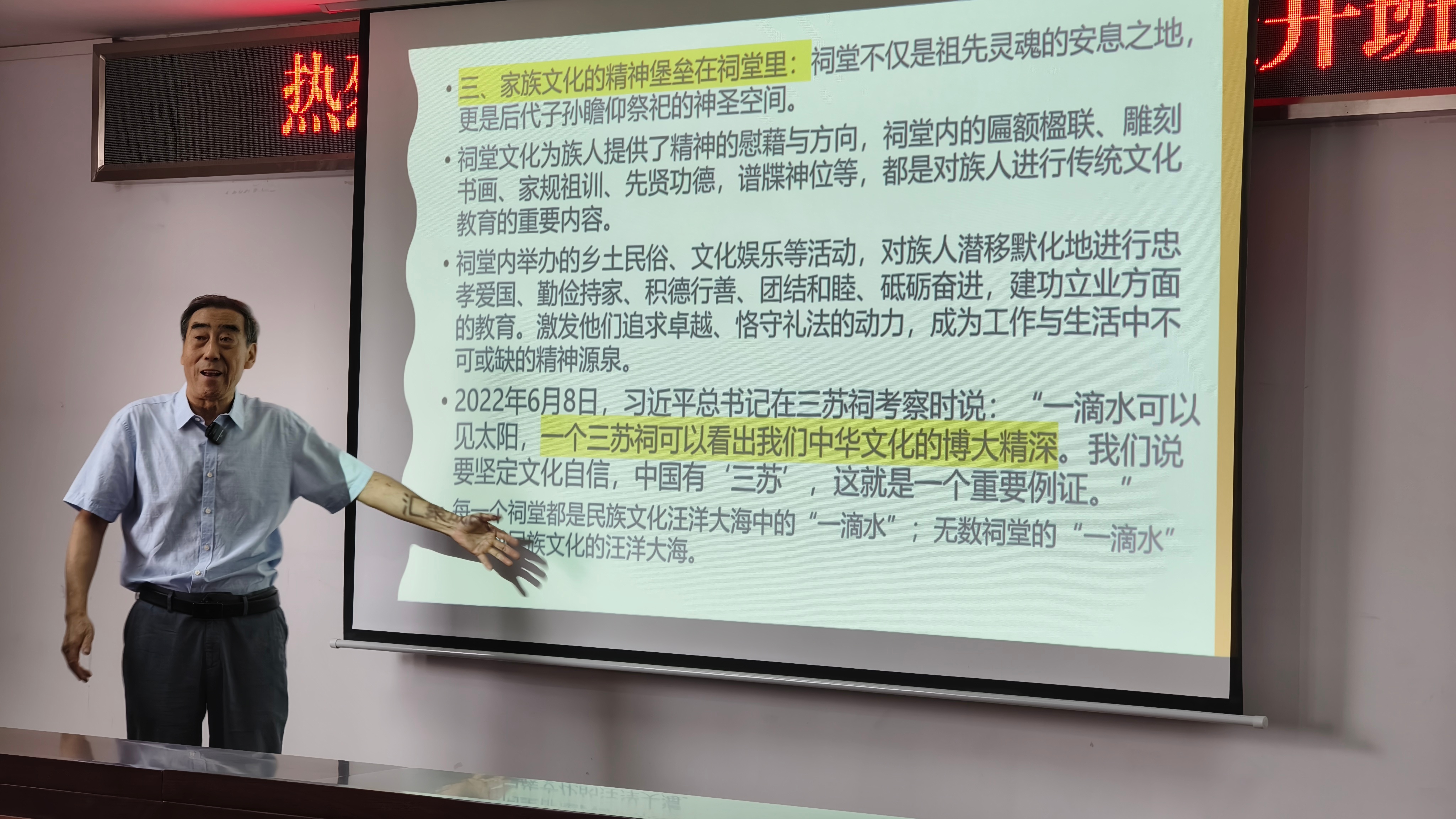 第二天的课程同样精彩。著名易学大师,浙江宁波人文工程学院原院长吴廷玉教授登坛开讲《拯救根脉文化》。吴教授一个半小时的课程中旁征博引,围绕家族治理、文脉传承、望族教育成功案例等内容进行讲解,令深受启发。
