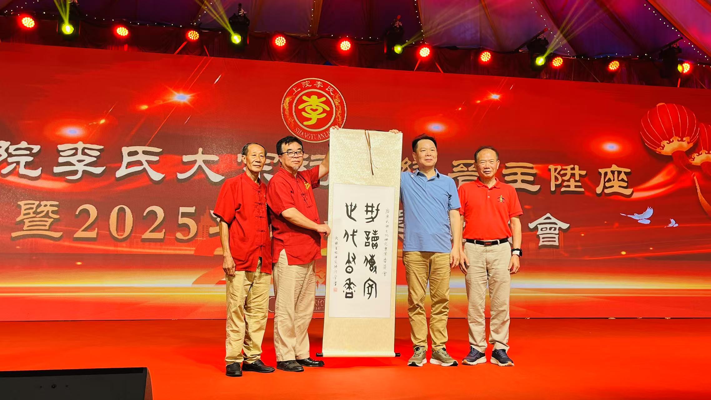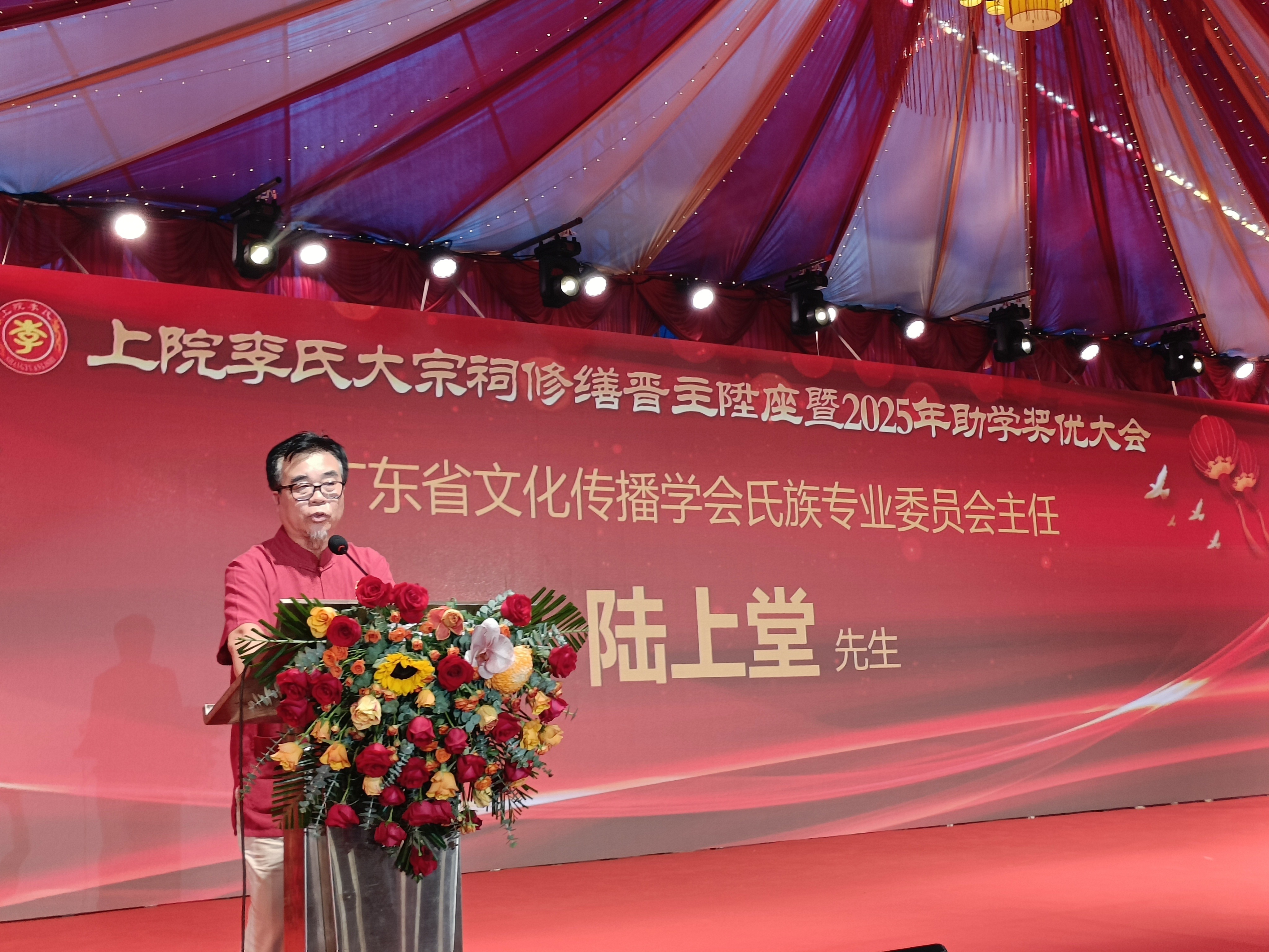 “今日,承蒙上院李氏理事会盛情相邀,我谨率专委会同仁,莅临人杰地灵的上院宝地,共同见证上院李氏大宗祠重光晋主盛典,以及奖掖学子、扶助后学的义举,深感荣幸!值此双喜临门之际,我谨代表广东省文化传播学会氏族文化研究专业委员会: